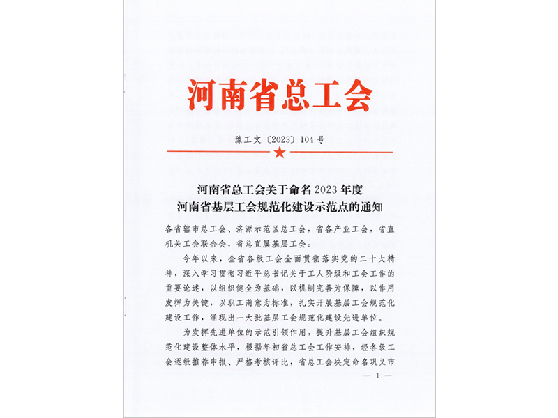 喜讯!日升公司工会委员会被河南省总工会命名为2023年度河南省基层工会规范化建设示范点